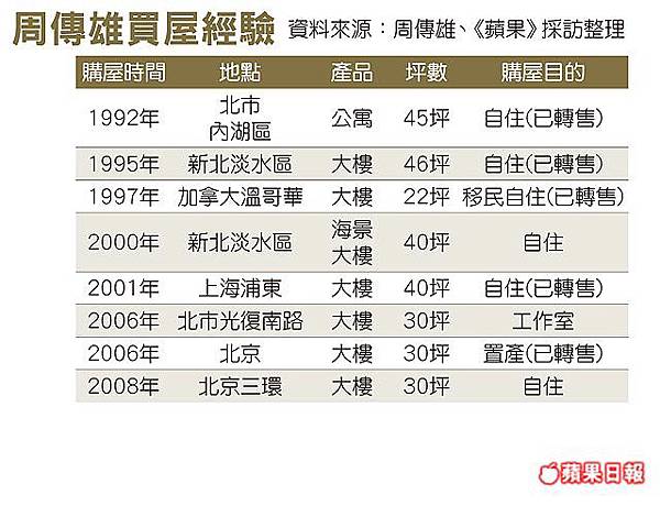 轉往淡水置產,「年輕時有迷思,想買面海景觀宅,反正不用朝九晚五趕上班」。1995年、2000年陸續在淡水買房,前者是淡海沙崙「淡水新都心」,46坪約500萬元,因地段不佳升值幅度小,2008年賣出,現仍留1戶自住。