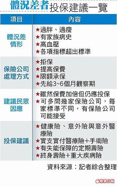壽險主管說,保險公司會根據投保人的身體狀況算分數,如果健檢的體重過重太胖、血壓過高等,超過一般正常值,超過標準太多,可能會被拒保,或是加倍承保。