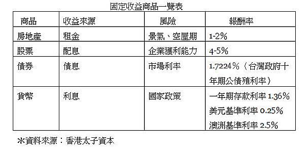 調查中顯示:有65%的台灣投資人,從目前儲蓄和投資中取得收益,其中藉由銀行存款取得固定收益的民眾更高達45%,遠高於全球平均的29%。在一般人的觀念中,固定收益商品既穩健又相對安全,缺點則是收益較低。至於,固定收益商品的收益來源、風險以及報酬率,如下表: