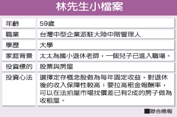 另外,為了增加穩定的收益,林先生當年也規劃當包租公,由林太太在台灣看房子,2007年經好友幫忙,在法拍市場購入台北市松山區一戶七樓的華廈,總價1000萬元,貸款500萬元。這間房子現在月租收入3萬元,房價則上漲了約六成。