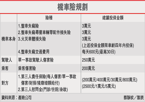此外,在機車發生交通事故時,後座乘客的危險程度,平均遠比機車騎士來得高。因此,除第三人責任保險外,陳文生也建議機車族加保乘客傷害險。