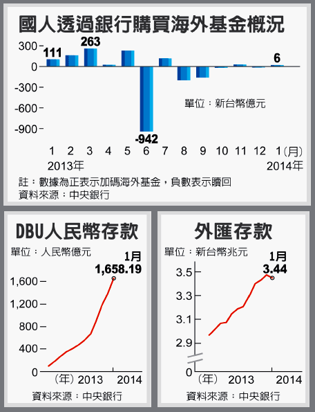 到了今年1月,國人透過銀行購買海外基金,金額只剩6億元,央行官員說,可能與民眾轉入人民幣存款有關。