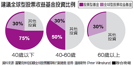 而40~60歲屬性穩健的投資人,股票型基金的配置比重可維持於50%,全球型股票收益基金比重可配置30%。60歲以上的投資人,若要要投資股票,建議以30%為主,但建議全數投資全球型股票收益基金作為全部股票部位,因主要是有利息的收益。