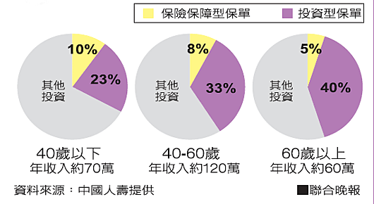 40~60歲的族群,年收入約增至120萬元為例,正處於工作經驗及收入的顛峰期,且多半是家中經濟支柱,一方面規劃退休準備,另一方面也要讓家庭責任獲得充分保障。因此,以家庭支出占59%,這時,投資型保單提高,從40歲的23%拉高至33%,保障型保險則降低至8%。由於40~60歲的族群多半具備投資理財經驗,可選擇一般投資標的,自行判斷調整配置,有機會享受投資績效。若手邊有一筆資金,如房租、股息收入,或是公司發放的年終獎金、績效獎金等,還可額外投入,加速累積資產,早日達成退休準備的目標。