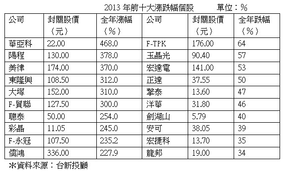 根據證交所統計,2013年各股報酬率最好是華亞科,達468.48%,最低則是F-TPK,為-64.06%,集中市場報酬率為11.85%,。