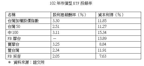 各股難選,不妨改抱市值型ETF,不用選股,投報率不差。 根據證交所統計,去年市值型ETF(指數股票型基金)投資報酬率表現佳,約有7~14%資本利得報酬,再加上2~3.3%現金股利,整體表現亮眼,收益穩健。