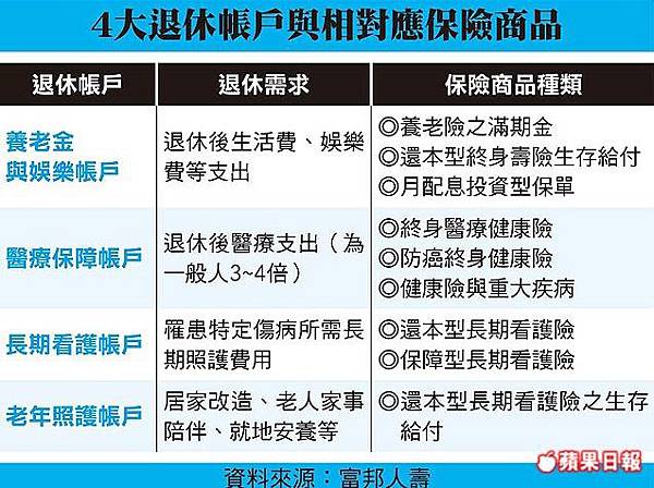 陳俊伴建議,養老金與娛樂帳戶可透過養老險滿期金準備、以還本型終身壽險的生存給付支應日常生活費、而以月配息投資型保單來準備出國娛樂基金;醫療保障帳戶可透過終身醫療健康險,來獲得醫療費用補償,並以防癌終身健康險、健康險與重大疾病險來做為重大疾病預備金。