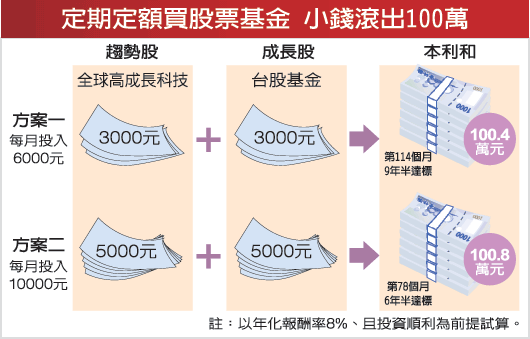 如果以每個月定期定額投入6000元為例,建議除了科技等趨勢股外,可再搭配一支成長股,特別建議挑選能創造超額報酬的台股基金,以3000元的金額每月定期定額扣兩支基金。以目標報酬率8%來設定,9年半後本利和為1004745元,突破百萬元。如果省下金額更多,例如每月可投入1萬元,則6年半就可達到投資目標。