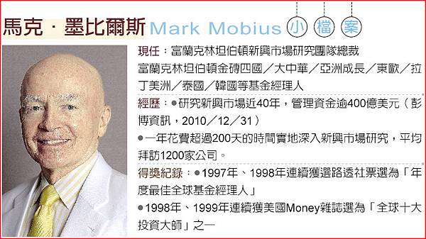 「新興市場教父」馬克‧墨比爾斯(Mark Mobius)在睽違三年之後,即將於4月1日來台,他剛結束拉美、非洲等新興市場拜訪的行程,將為台灣投資人帶來第一手投資新知。