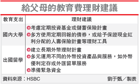 根據滙豐集團最新「教育的價值:邁向成功的跳板」報告指出,台灣父母在所有教養經費中,教育支出比重約44%,可見得高等教育經費是父母主要財務負擔來源。滙豐建議民眾可利用優利定存、定期基金或儲蓄保險,打造長期教育財務規畫。