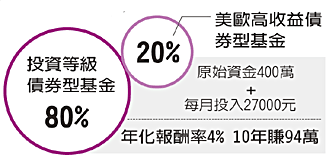 假設王先生將目前手中的400萬元存款全數進行投資,為完成理財目標並以控管風險作為首要考量、投資報酬退為次要因素,建議投資在預期報酬率相對較低、但表現也相對穩健的投資等級債券型基金,建議配置的比重可拉高至80%,而預期報酬率相對較高、但波動也相對較高的美歐高收益債券型基金,建議應控管配置比重至20%。若設定加權年化報酬率在4%左右,且期間每個月再投入27000元資金定期定額,如此10年後投資成果可累積到94萬元資金,可達到王先生在60歲預備退休時,累積退休金1000萬元資金的目標。富蘭克林證券投顧表示,在投資方向上,考量美歐已開發國家公債殖利率已處於相對低點,投資價值較為有限,隨著經濟前景轉佳,殖利率攀升的風險亦逐步升高,因此在投資等級債券型基金的配置上,應盡量避開已開發國家公債,而是側重在財政體質相對較佳的新興國家投資級政府債券,或者是全球經濟溫和復甦有利於企業獲利成長,可望因而受惠的投資等級公司債市。
