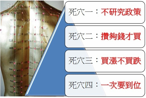 台灣房價〝貴森森〞,甚至被報載成為「世界第一」,不過買了房的人盼望大漲,沒買的則是懇求大跌,除了房地產業名言“地段、地段、地段”之外,小心別為了一間房而把自己的生活品質賠了進去,有專家就把要買房子可能會遭遇的「死穴」給點了出來,還教了大家如何解開買房的四大死穴。