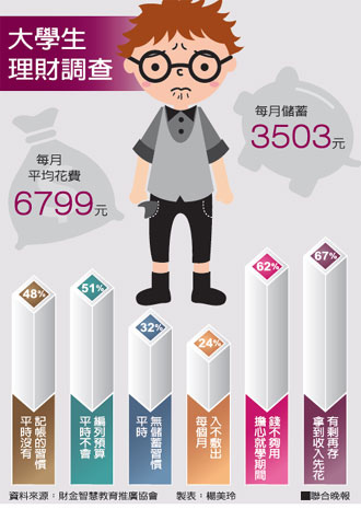 這項問卷結果顯示,大學生參加理財講座後,原有62%受訪大學生擔心就學期間錢不夠用,上課後的擔憂比率下降至55%;課前原有24%受訪者每月入不敷出,課後降至17%;課前原有48%沒有記帳習慣,上課後降至33%。