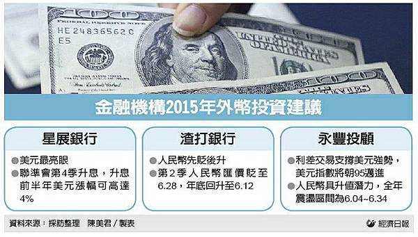 展望2015年外幣投資,星展銀行財富管理投資顧問部副總裁林雅慧表示,「美元還會是最亮眼的一個」,其他貨幣將持續受到壓抑。她認為,美國聯準會第4季才會升息,美元指數還有上漲空間,根據過去經驗,升息前半年漲幅可高達4%。
