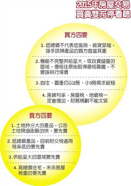 另外,市場行情絕對要隨時掌握,除了網路上實價登錄查詢資源外,不妨先請有往來的銀行代為預估可貸金額,以確保負擔能力、避免下訂後出現變數。最後,區域、產品市場的定位要釐清,精華區、外圍區供需條件大不同,抗跌能力也差很大,千萬不要在即將形成多殺多的地雷區追高,但若有地緣關係、自住需求,也要借力使力議價、撿便宜。